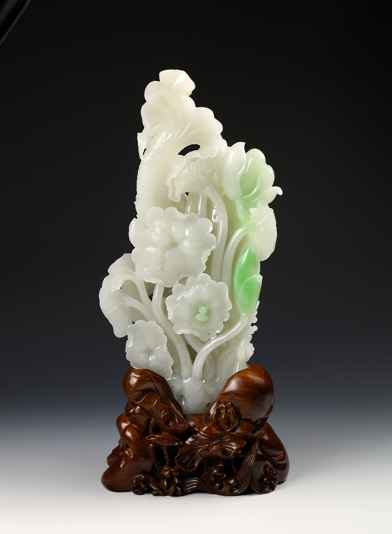 此作品造型精致大气,主体为鱼戏荷叶。双鱼依次高高跃起,激得水花翻涌,荷枝摇曳。作品将其最富动态的一瞬精准的展现出来,使得整器倍显生动,有种惊心动魄的美。除此之外,下落之鱼口中衔花,送予下方小鱼,那种温馨之感,更令人忍不住会心一笑。 作者妙用巧雕手法,将翠青白玉的翠色部分琢作一枝含苞待放的碧荷,姿态优美,似随风动,俨然有画龙点睛之妙。